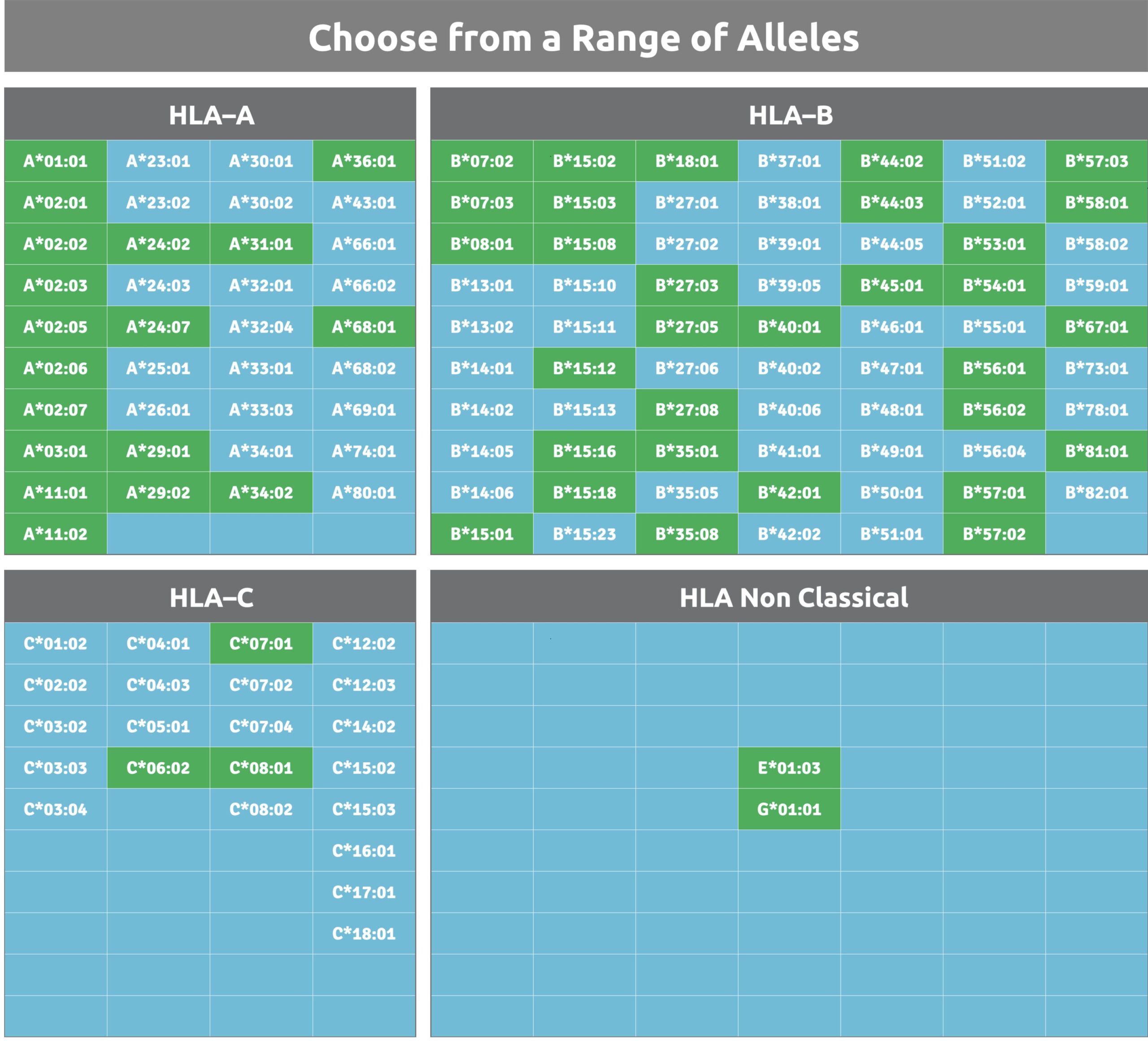 Choose from more than 35 HLA-A alleles to detect, profile, or monitor antigen-specific immune responses from antibodies to immune cell populations